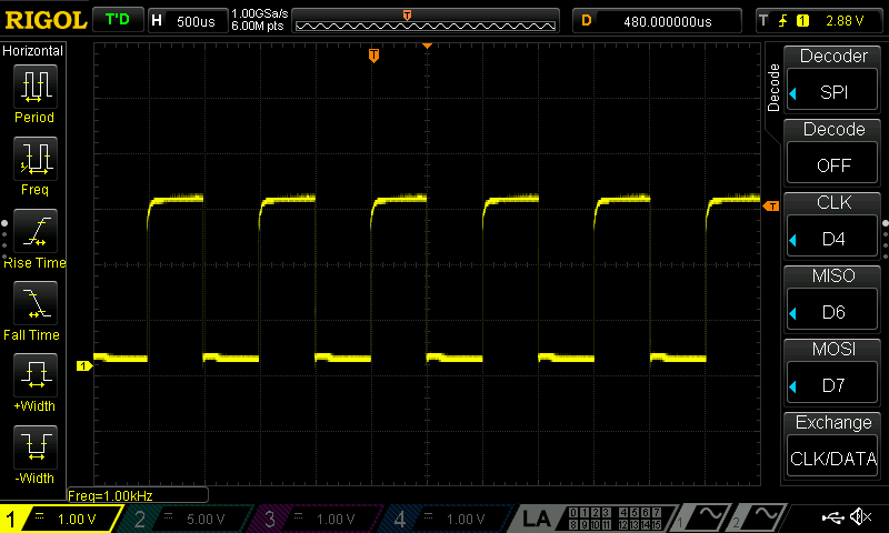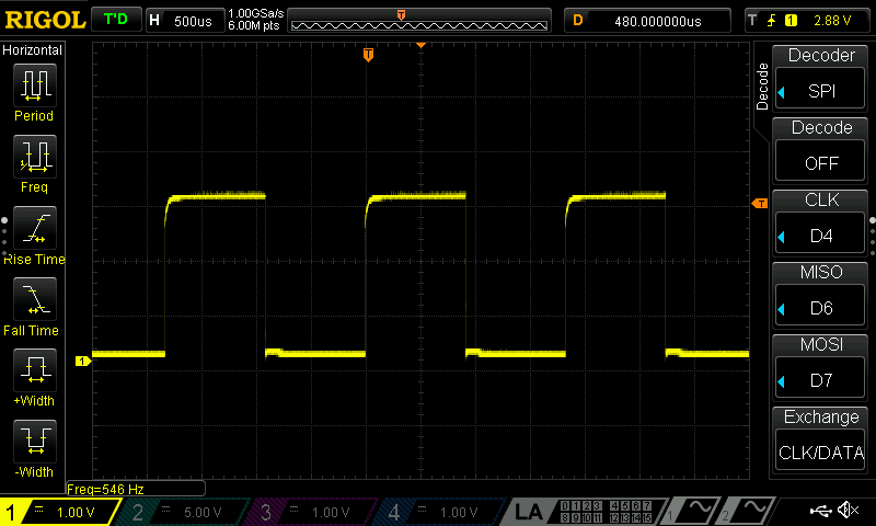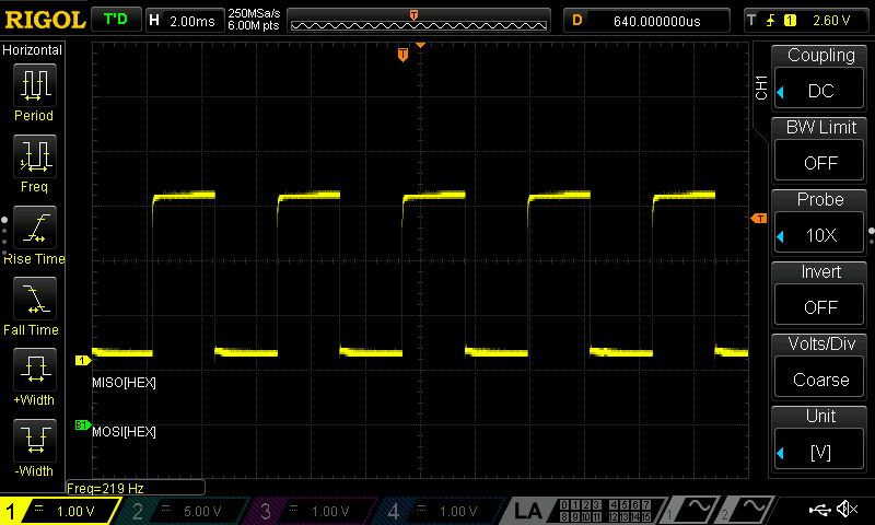 The design performed as expected. It played a song on a speaker using the PWM and upcounting modes in the STM32L432KC microcontroller timers. The signal was driven through an audio amplifier that allowed for adujustment of the volume of the speaker with a potentiometer. Output frequencies and delays were accurate within 1%. See Figures 2, 3, and 4 below for the output freuqencies for 220, 550, and 1000 Hz, respectively.
