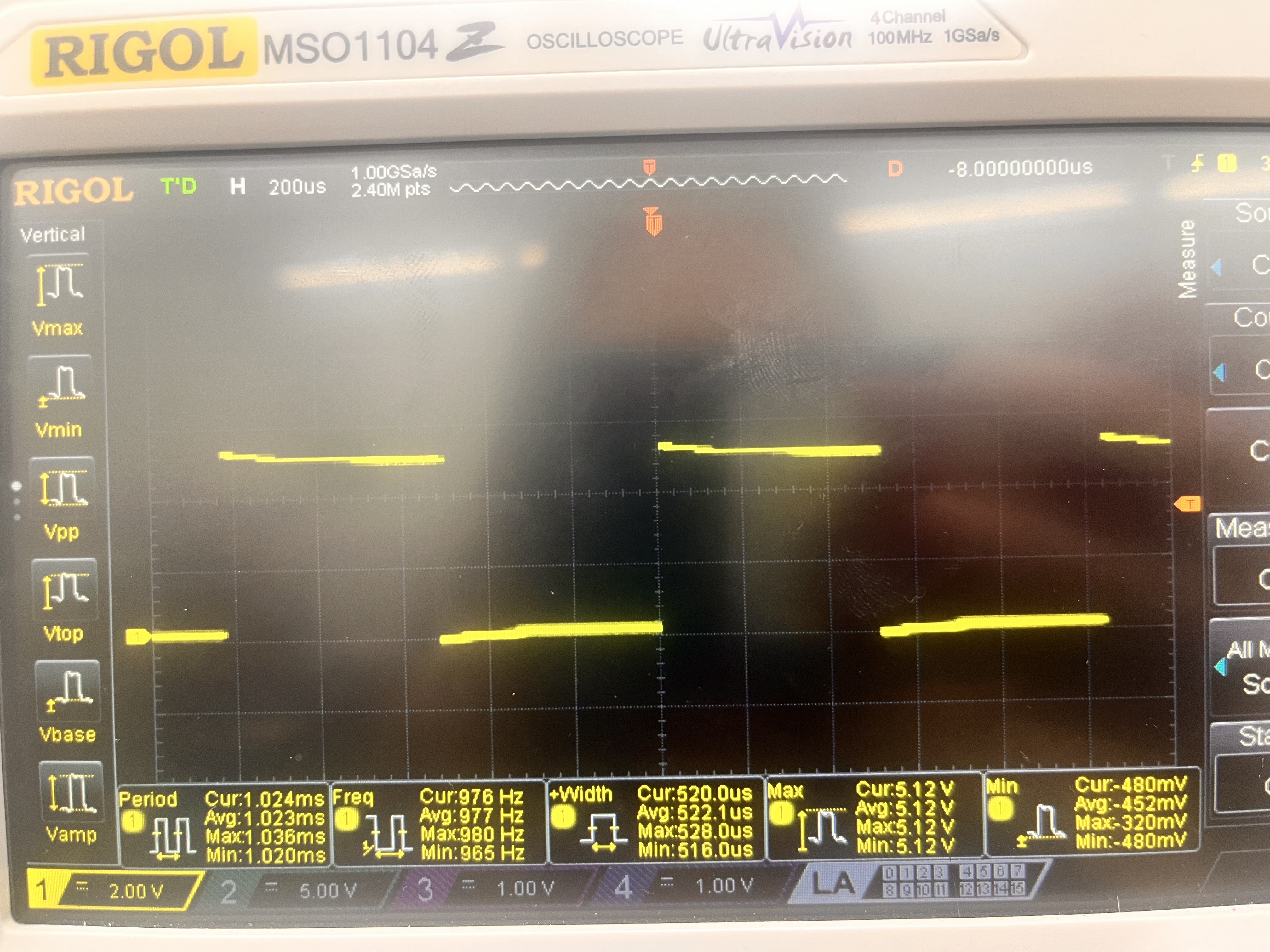 Figure 3: Image of the output waveform of output A of the motor encoder. Note the average period of 1.023 ms.