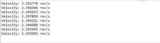 At 10.03V, my program was measuring that the velocity was around 2.393 rev/s (Figure 4). I also measured the output of the motor encoder using an oscilloscope (see Figure 3 below) and found that one pulse had a period of 1.023ms, corresponding to a velocity of 2.396 rev/s, indicating an error of 0.12%.