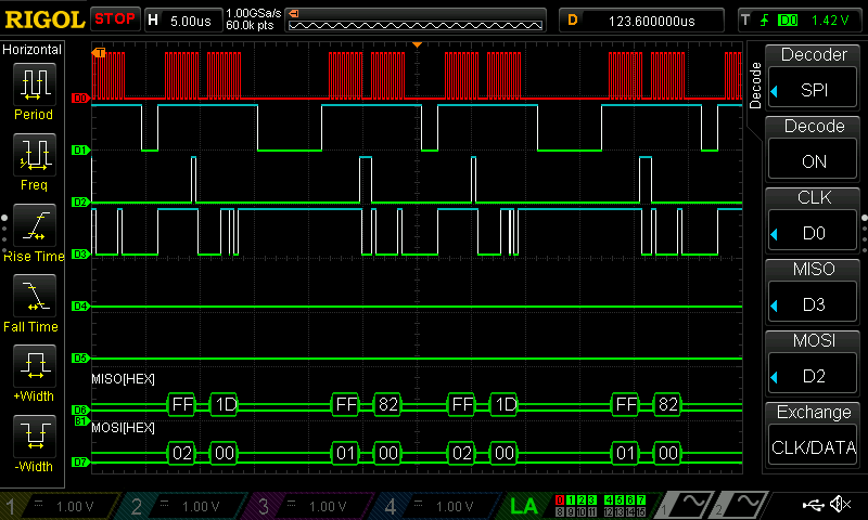 The MCU communicates with the DS1722 digital temperature sensor over SPI. The clock of the SPI is set to 2.5 MHz by dividing the system clock of 80 MHz. Data is written to the temperature sensor to indicate which resolution the temperature should be read at. Then, temperature data is sent back from the sensor to the MCU, 8 bits at a time. The temperature is stored in two’s complement floating-point format.