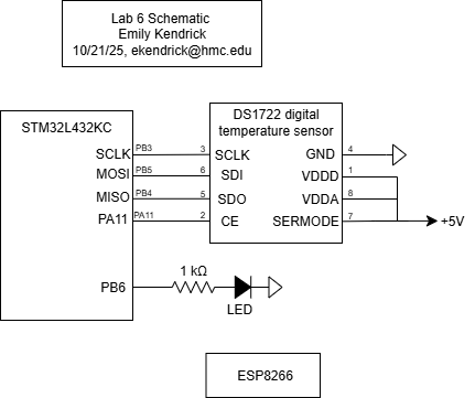 The design successfully implemented SPI communication to communicate with a temperature sensor to get temperature measurements. It also communicated via UART with a WiFi module to host a webpage to display the temperature and the status of an LED. I spend around 20 hours on this lab, mostly due to stupid mistakes (such as not realizing that the ribbon cable for the oscilloscope had a few broken pins despite the fact that someone had told me that, and using a pin for CE that was also being used for UART).